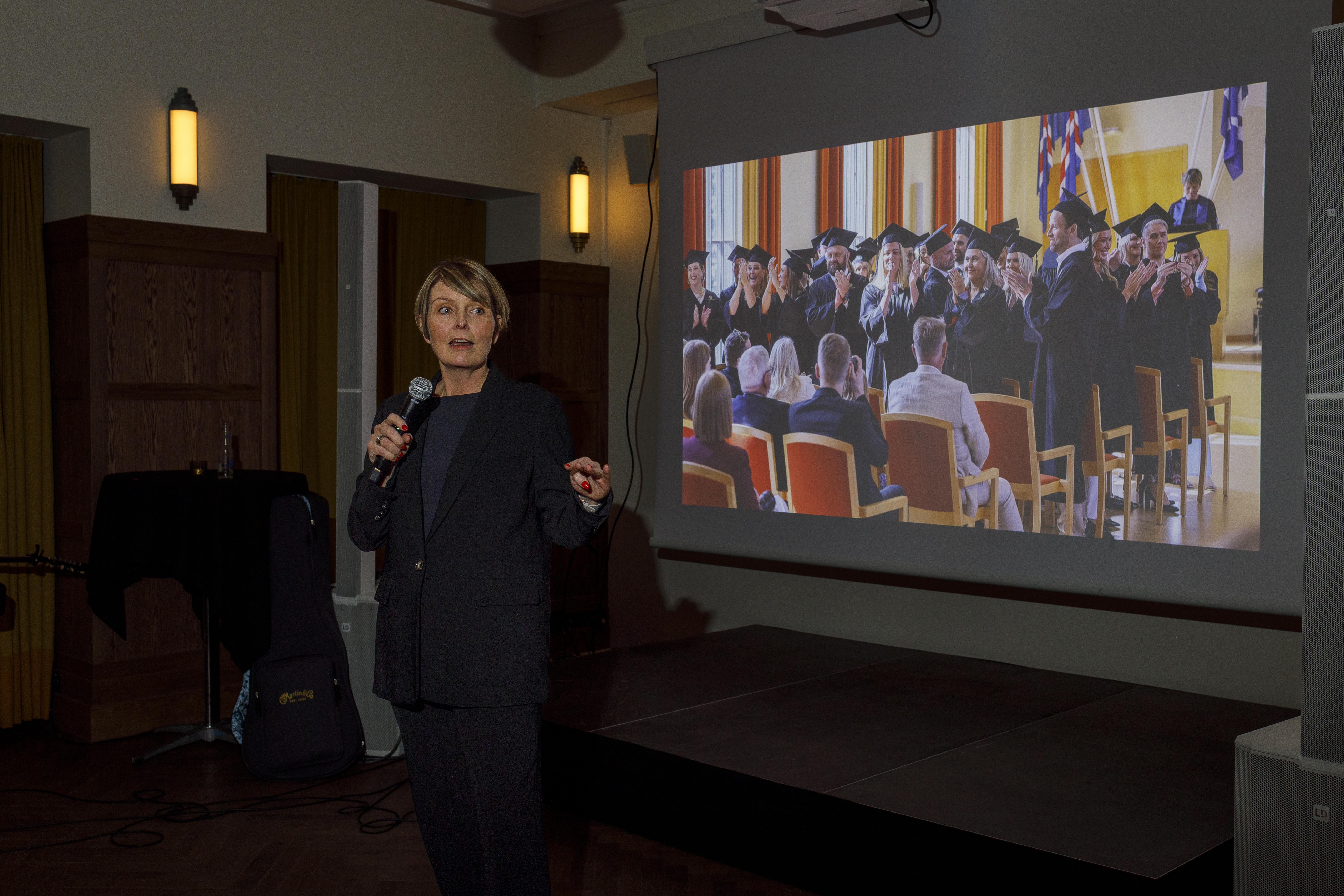 Ásta Dís Óladóttir, prófessor og stjórnarformaður Executive MBA-námsins, bauð gesti velkomna og stiklaði á stóru í sögu námsins. Hún rifjaði upp að námið væri elsta Executive MBA-nám landsins og hefði markað spor í íslensku atvinnulífi frá fyrsta degi. Þá lagði hún sérstaka áherslu á framlag Runólfs Smára Steinþórssonar prófessors, sem átti afgerandi þátt í stofnun þess árið 2000.